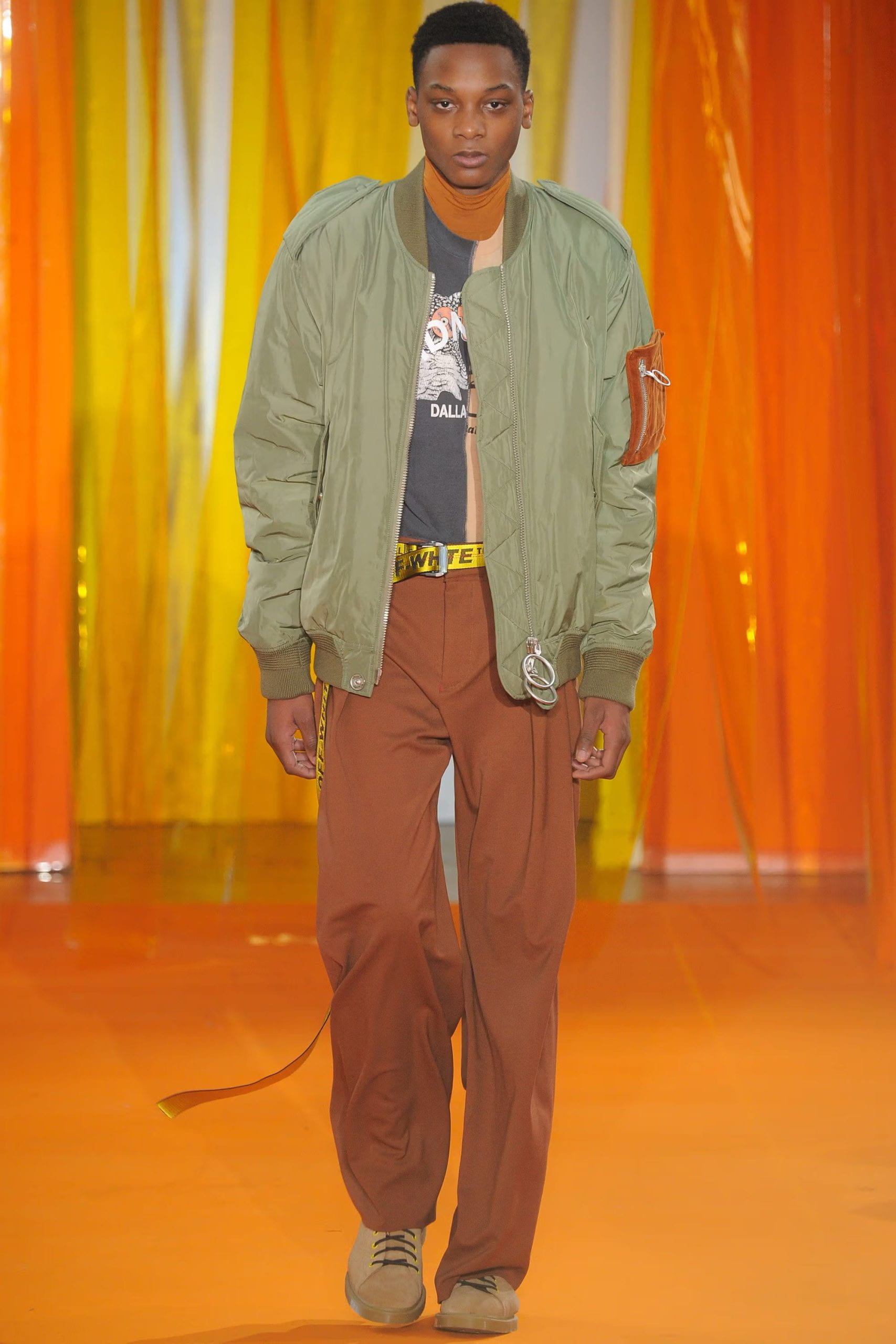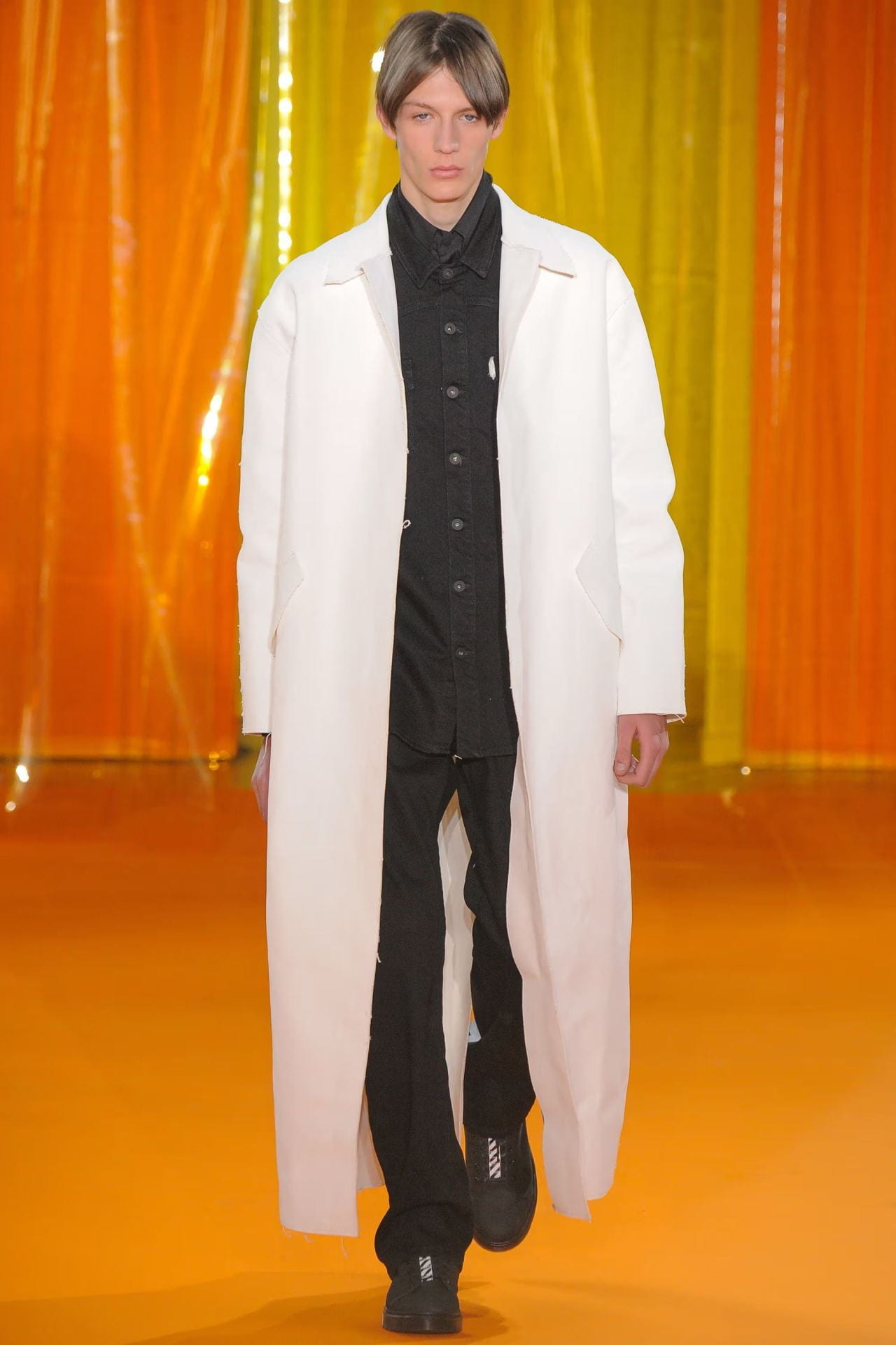 “For Abloh’s latest seasonal showing, the American designer builds upon his ongoing affinity for classic English menswear tapped with a heavy streetwear influence. Fall/Winter 2016 starts with a monochromatic color scheme juxtaposing high and street, from trench motos to herringbone jumpsuits. The cold-weather range then takes a vibrant turn with orange and purple checkered prints, followed by earthy hues of green and brown, then finished with super bright overcoats matching the runway they’re paraded on. Deconstruction is also seen throughout the collection, staying in line with his past offerings. What you may not notice however, is the revealing of OFF-WHITE’s T-shirt collaboration with MIDNIGHT STUDIOS towards the end of the gallery.”